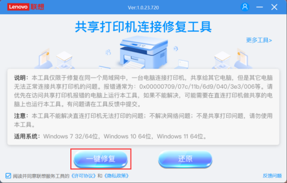 请优先在访问共享打印机报错的电脑上运行本工具,如果不能解决,可能需要在直连打印机做共享的电脑上也运行本工具。
